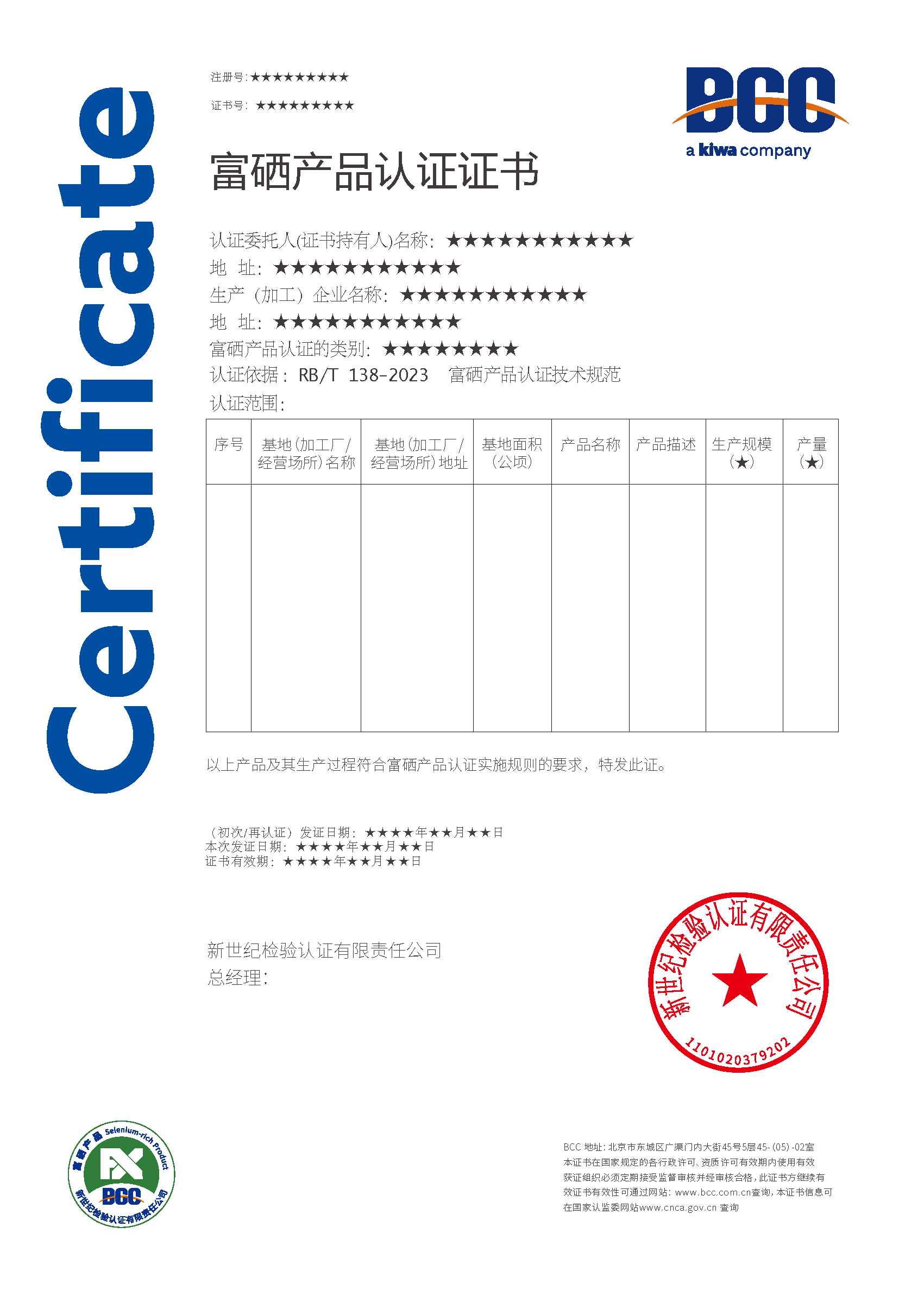 富硒產(chǎn)品認(rèn)證證書(shū)有效期最長(zhǎng)為12個(gè)月。獲證組織應(yīng)至少在認(rèn)證證書(shū)有效期結(jié)束前3個(gè)月向BCC提出再認(rèn)證申請(qǐng)。