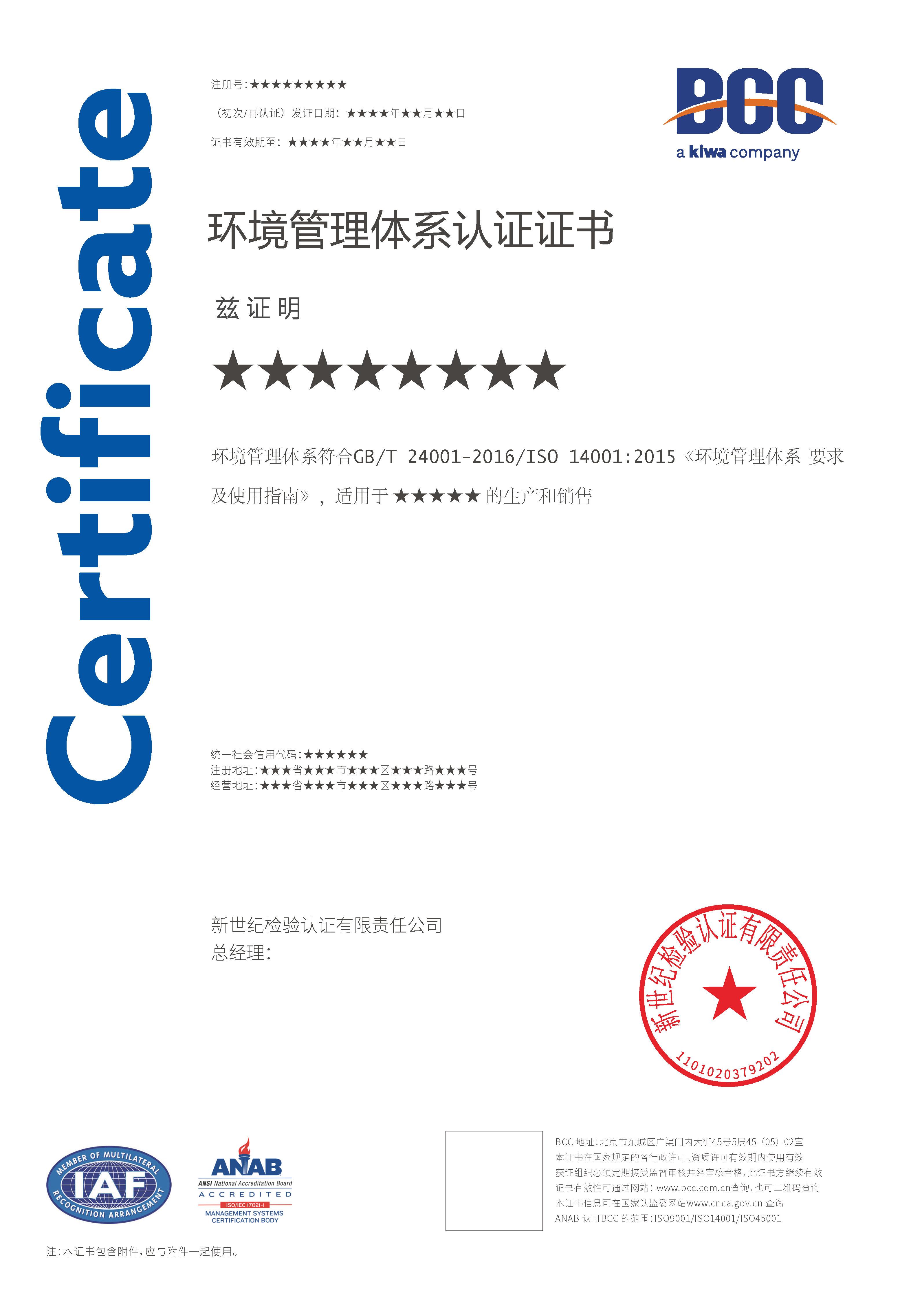 本頁涉及的認證服務中均有對應的《認證實施規(guī)則》,BCC擁有其最終解釋權。任何組織及個人未經BCC許可,不得以任何形式全部或部分使用(法律要求除外)認證相關信息。如需獲取相關實施規(guī)則請用以下方式聯(lián)系獲?。弘娫挘?10-58579316 郵箱:fwjs@kiwa.cn