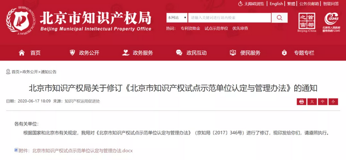 6月17日,為深化實(shí)施創(chuàng)新驅(qū)動(dòng)戰(zhàn)略和首都知識(shí)產(chǎn)權(quán)戰(zhàn)略,進(jìn)一步規(guī)范知識(shí)產(chǎn)權(quán)試點(diǎn)示范單位認(rèn)定與管理工作,北京市知識(shí)產(chǎn)權(quán)局修訂的《北京市知識(shí)產(chǎn)權(quán)試點(diǎn)示范單位認(rèn)定與管理辦法》(京知局〔2020〕171號(hào))正式發(fā)布。