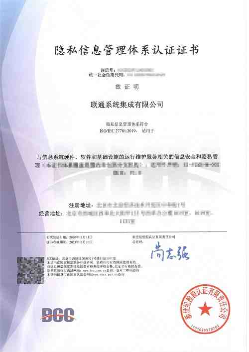 2020年11月13日,聯(lián)通系統(tǒng)集成有限公司(以下簡稱:聯(lián)通系統(tǒng)集成)順利獲得由新世紀(jì)檢驗認(rèn)證有限責(zé)任公司(以下簡稱:BCC)頒發(fā)的ISO/IEC 27701 隱私信息管理體系認(rèn)證證書。