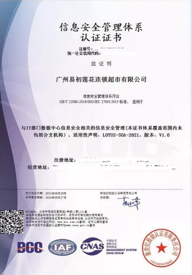 本次獲得BCC頒發(fā)的信息安全管理體系認(rèn)證證書(shū),標(biāo)志著廣州易初蓮花在識(shí)別信息安全風(fēng)險(xiǎn),減少可能存在的信息安全隱患,提升員工信息安全意識(shí),實(shí)現(xiàn)良性發(fā)展方面又邁進(jìn)一步!
