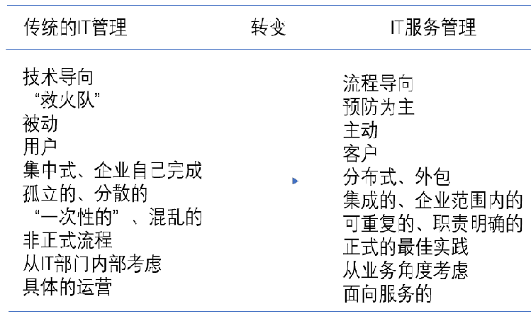 根本出發(fā)點(diǎn)在于通過(guò) IT 服務(wù)有力的支持企業(yè)的發(fā)展以及業(yè)務(wù)部門業(yè)務(wù)的開(kāi)展,促進(jìn)企業(yè)競(jìng)爭(zhēng)力的有效提升。在 IT 管理當(dāng)中,IT 服務(wù)管理屬于不可或缺的構(gòu)成部分。但是IT 服務(wù)管理有別于傳統(tǒng)的 IT 管理,其存在的意義在于將基于服務(wù)之上的 IT 管理提供給購(gòu)買 IT 服務(wù)的企業(yè)或內(nèi)部部門。