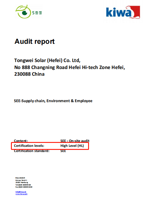 6月14日,Kiwa集團向通威股份旗下的全資子公司——通威太陽能(合肥)有限公司(以下簡稱通威太陽能)頒發(fā)了SEE現(xiàn)場評估報告。成為全球首家完成該評估的光伏生產(chǎn)企業(yè),也是Kiwa集團在中國地區(qū)實施的首家依據(jù)SEE標(biāo)準的ESG現(xiàn)場評估活動。